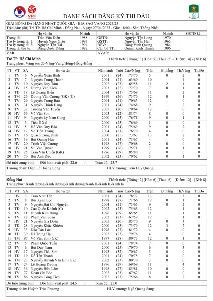 Danh sách đăng ký thi đấu CLB Trẻ TP.HCM vs CLB Đồng Nai (vòng 16 Giải HNQG Bia Sao Vàng 2024/25)
