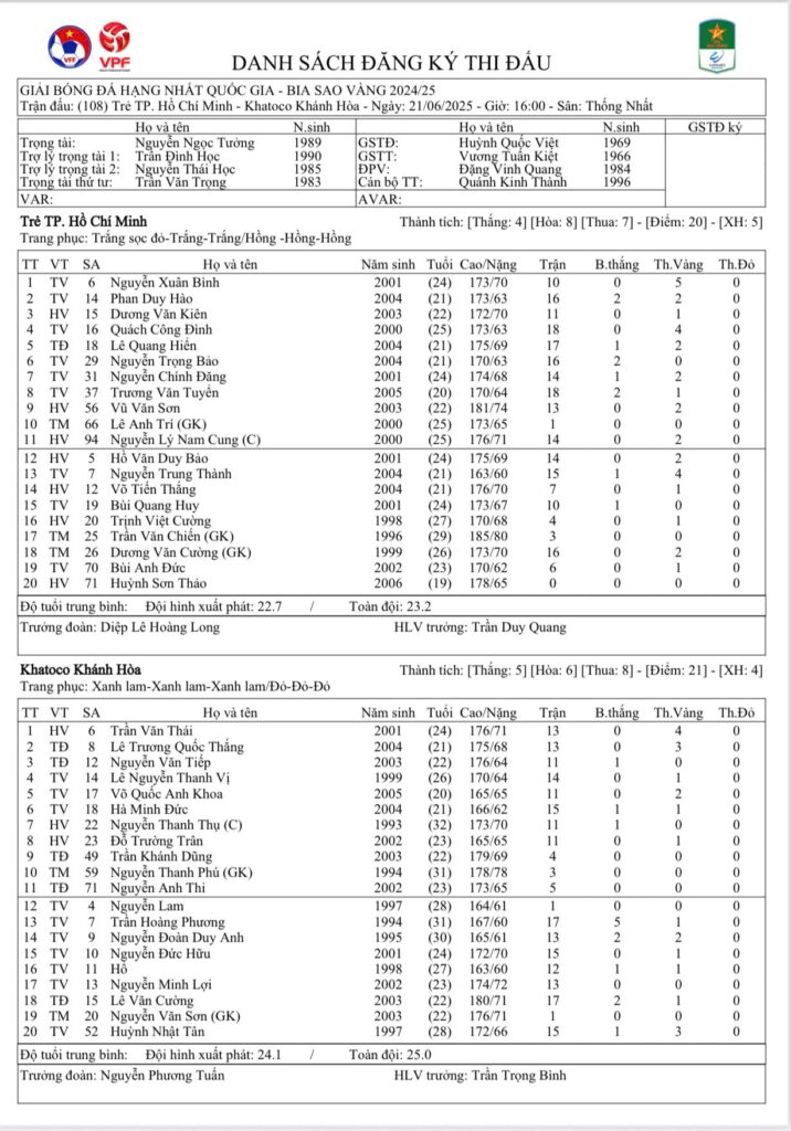 Danh sách đăng ký thi đấu CLB Trẻ TP.HCM vs CLB Khatoco Khánh Hoà (vòng 22 HNQG Bia Sao Vàng 2024/25)