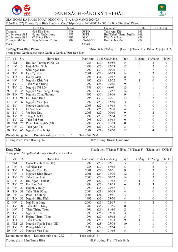 Danh sách đăng ký thi đấu CLB Trường Tươi Bình Phước vs CLB Đồng Tháp (vòng 16 HNQG Bia Sao Vàng 2024/25)
