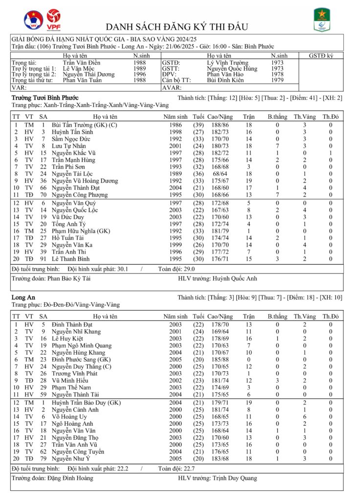 Danh sách đăng ký thi đấu CLB Trường Tươi Bình Phước vs CLB Long An (vòng 22 HNQG Bia Sao Vàng 2024/25)
