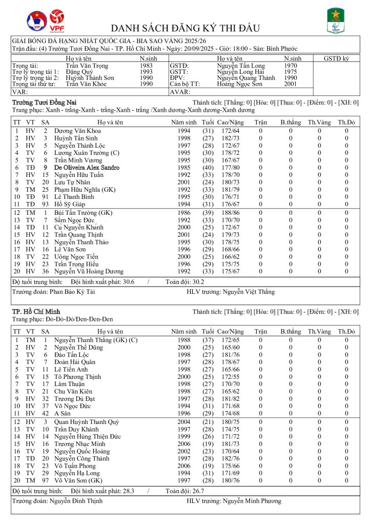 Danh sách đăng ký thi đấu CLB Trường Tươi Bình Phước vs CLB TP Hồ Chí Minh (vòng 1 HNQG Bia Sao Vàng 2025/26)