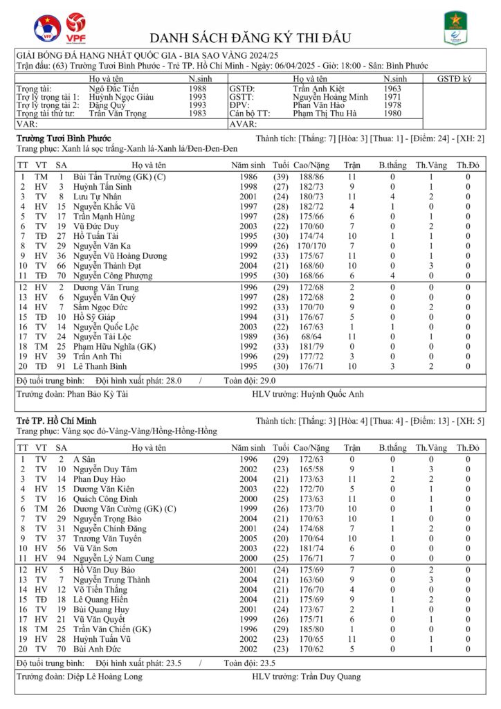 Danh sách đăng ký thi đấu CLB Trường Tươi Bình Phước vs CLB Trẻ TP.HCM (vòng 13 HNQG Bia Sao Vàng 2024/25)