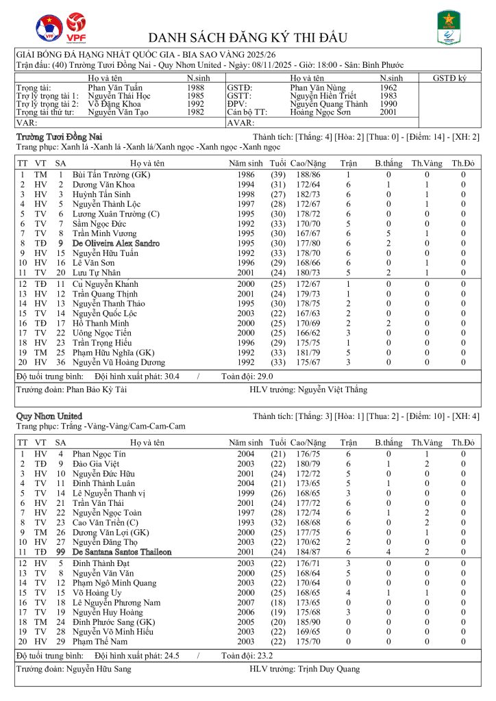 Danh sách đăng ký thi đấu CLB Trường Tươi Đồng Nai vs CLB Quy Nhơn United (vòng 7 HNQG Bia Sao Vàng 2025/26)