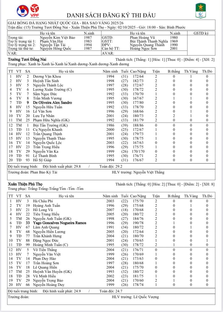 Danh sách đăng ký thi đấu CLB Trường Tươi Đồng Nai vs CLB Xuân Thiện Phú Thọ (Vòng 3 Giải HNQG Bia Sao Vàng 2025/26)