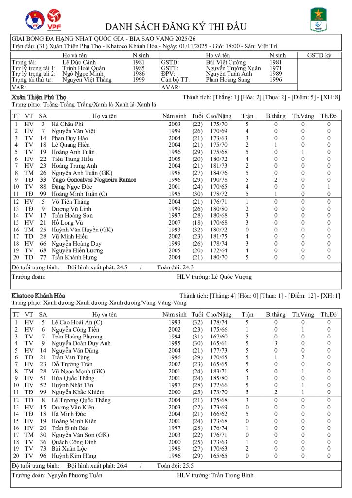 Danh sách đăng ký thi đấu CLB Xuân Thiện Phú Thọ vs CLB Khatoco Khánh Hòa (vòng 6 HNQG Bia Sao Vàng 2025/26)