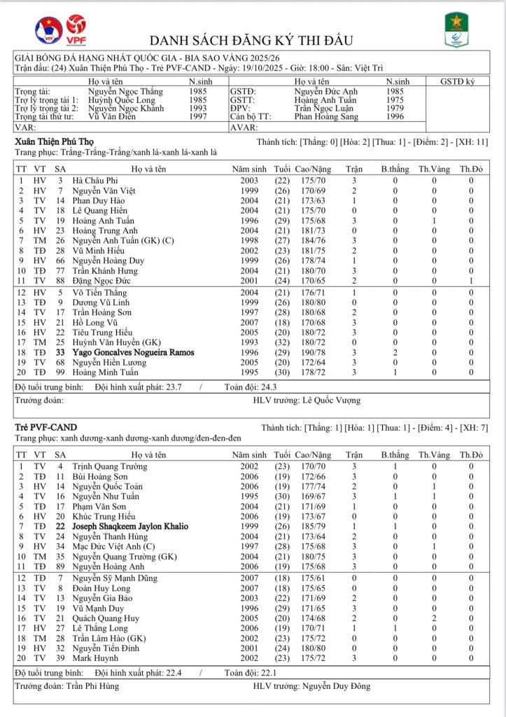 Danh sách đăng ký thi đấu CLB Xuân Thiện Phú Thọ vs CLB Trẻ PVFCAND (vòng 4 Giải HNQG Bia Sao Vàng 2025/26)