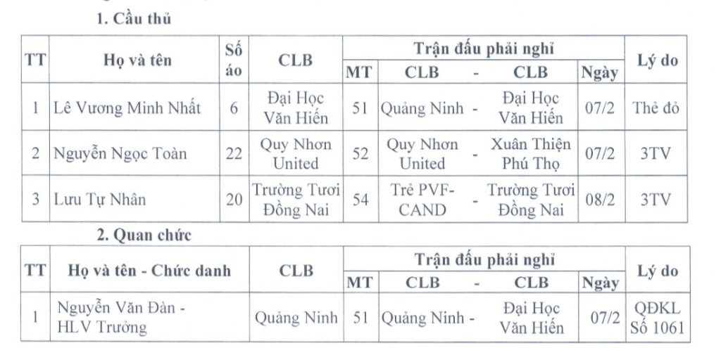 Căn cứ tổng hợp kết quả các trận đấu vừa qua của Giải bóng đá HNQG – Bia Sao Vàng 2025/26 và Quyết định kỷ luật của Liên đoàn Bóng đá Việt Nam; Ban Tổ chức Giải thông báo danh sách cầu thủ nghỉ thi đấu và quan chức nghỉ làm nhiệm vụ tại các trận đấu vòng 9 của Giải, cụ thể như sau: