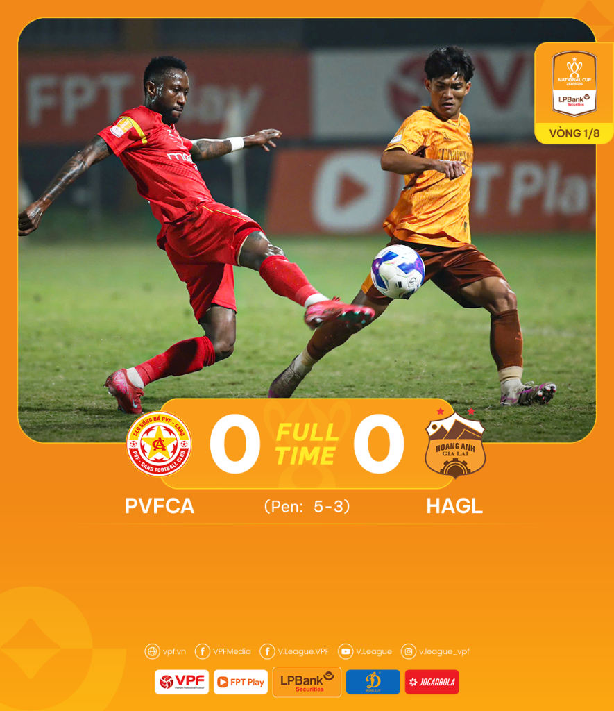 Hòa nhau 0-0 sau hai hiệp đấu chính thức, CLB PVF-CAND và HAGL bước vào loạt sút 11m để tìm ra đội chiến thắng bước tiếp vào Tứ kết. Trên chấm cân não, thủ môn Minh Long – người có nhiều kinh nghiệm chinh chiến hơn đồng nghiệp bên kia chiến tuyến, trở thành người hùng của đội bóng khi bắt bài và cản phá thành công tình huống sút 11m của Cao Hoàng Minh (số 20, HAGL). Và cầu thủ Bá Đạt (số 17, PVF-CAND) không có sai sót để ấn định chiến thắng 5-3 cho đội chủ nhà.