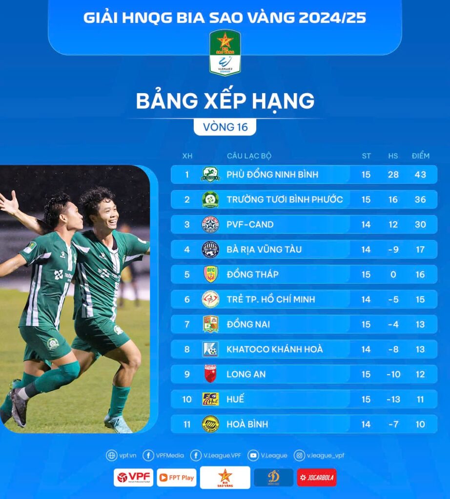 Bảng xếp hạng sau vòng 16 Giải HNQG Bia Sao Vàng 2024/25: