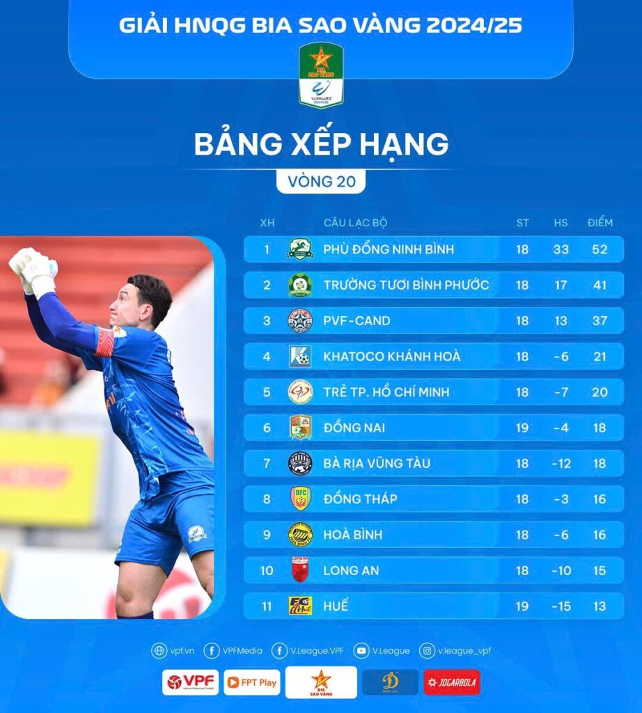 Bảng xếp hạng sau vòng 20 Giải HNQG Bia Sao Vàng 2024/25: