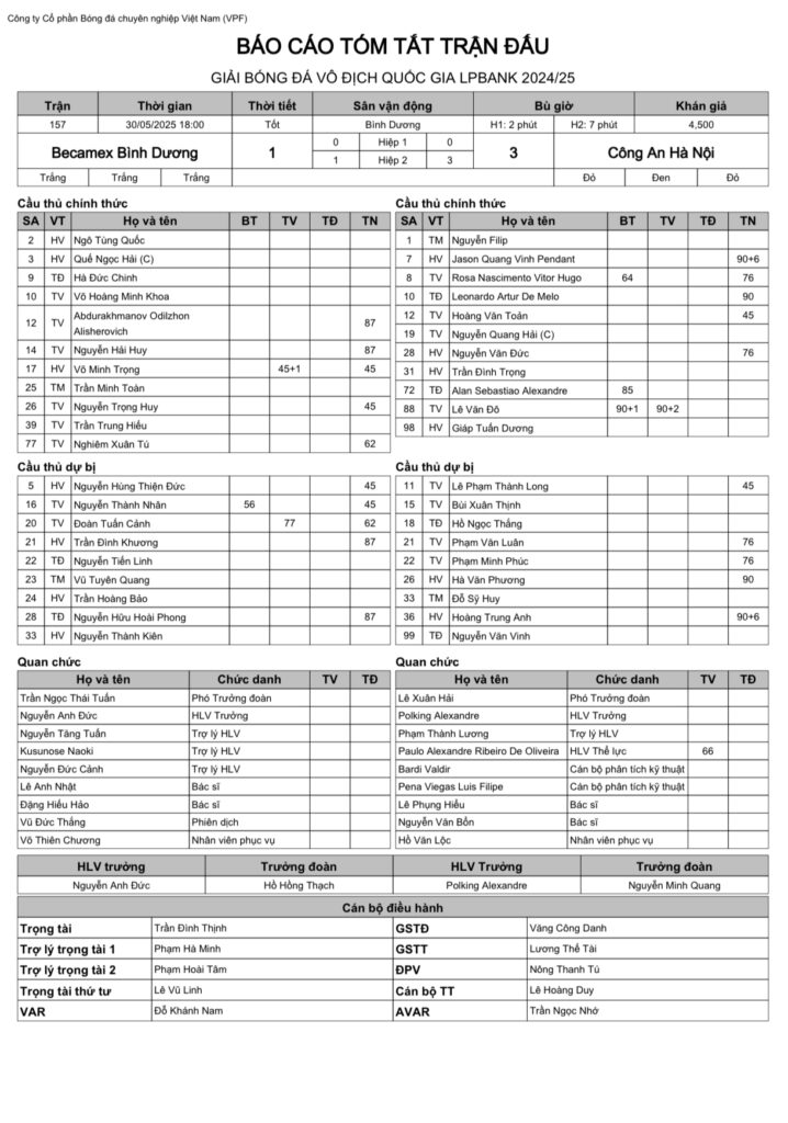 Báo cáo trận đấu CLB Becamex Bình Dương vs Công an Hà Nội (trận đấu bù vòng 23 LPBank V.League 1-2024/25)