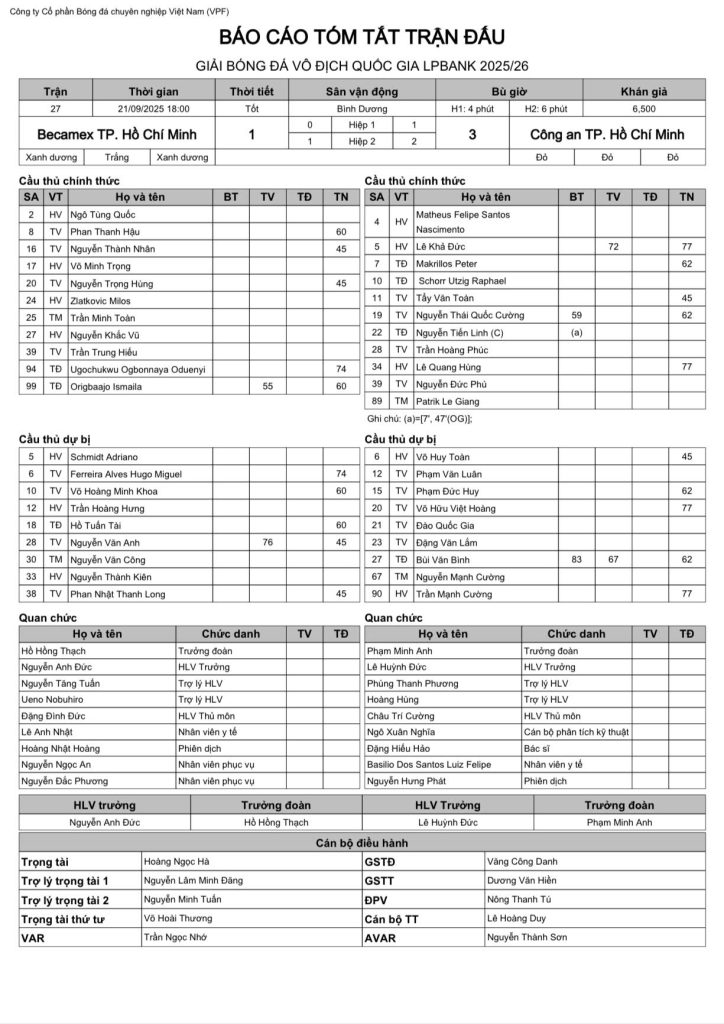 Báo cáo trận đấu CLB Becamex TP Hồ Chí Minh vs CLB Công An TP Hồ Chí Minh (vòng 4 VĐQG LPBank 2025/26)