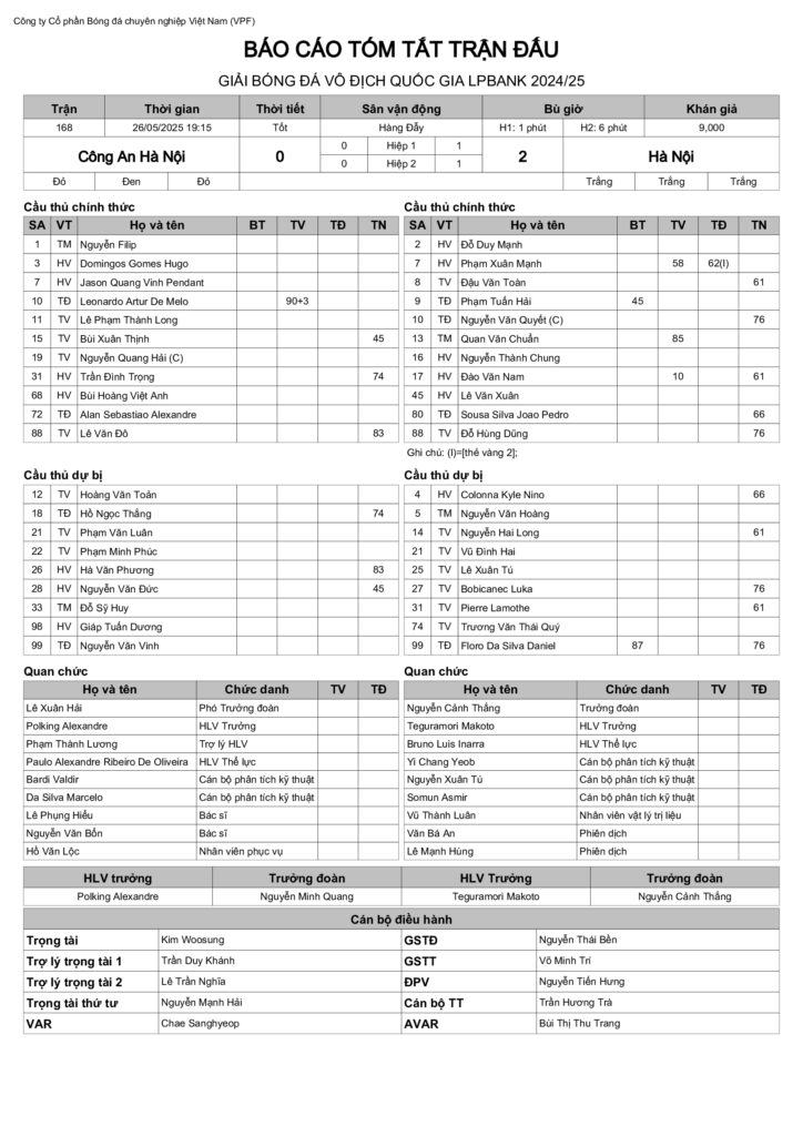 Báo cáo trận đấu CLB Công An Hà Nội vs CLB Hà Nội (vòng 24 VĐQG LPBank 2024/25)