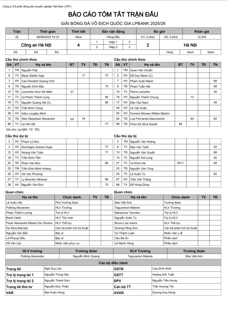 Báo cáo trận đấu CLB Công An Hà Nội vs CLB Hà Nội (vòng 3 VĐQG LPBank 2025/26)