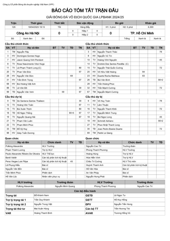 Báo cáo trận đấu CLB Công An Hà Nội vs CLB TP.HCM (vòng 19 VĐQG LPBank 2024/25)
