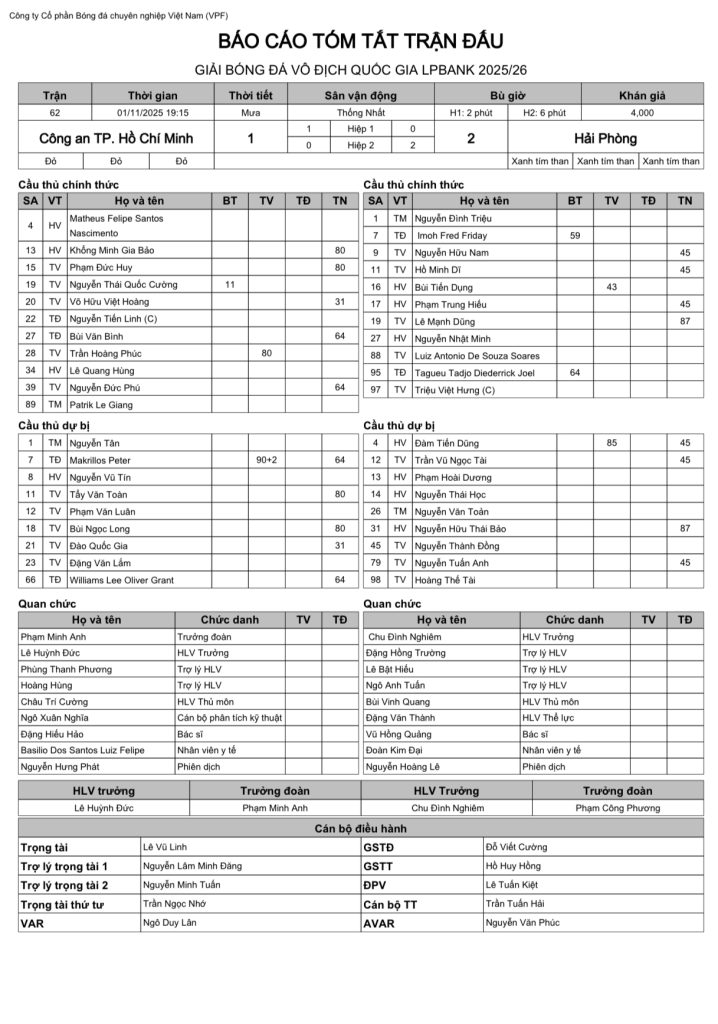 Báo cáo trận đấu CLB Công An TP Hồ Chí Minh vs CLB Hải Phòng (vòng 9 VĐQG LPBank 2025/26)