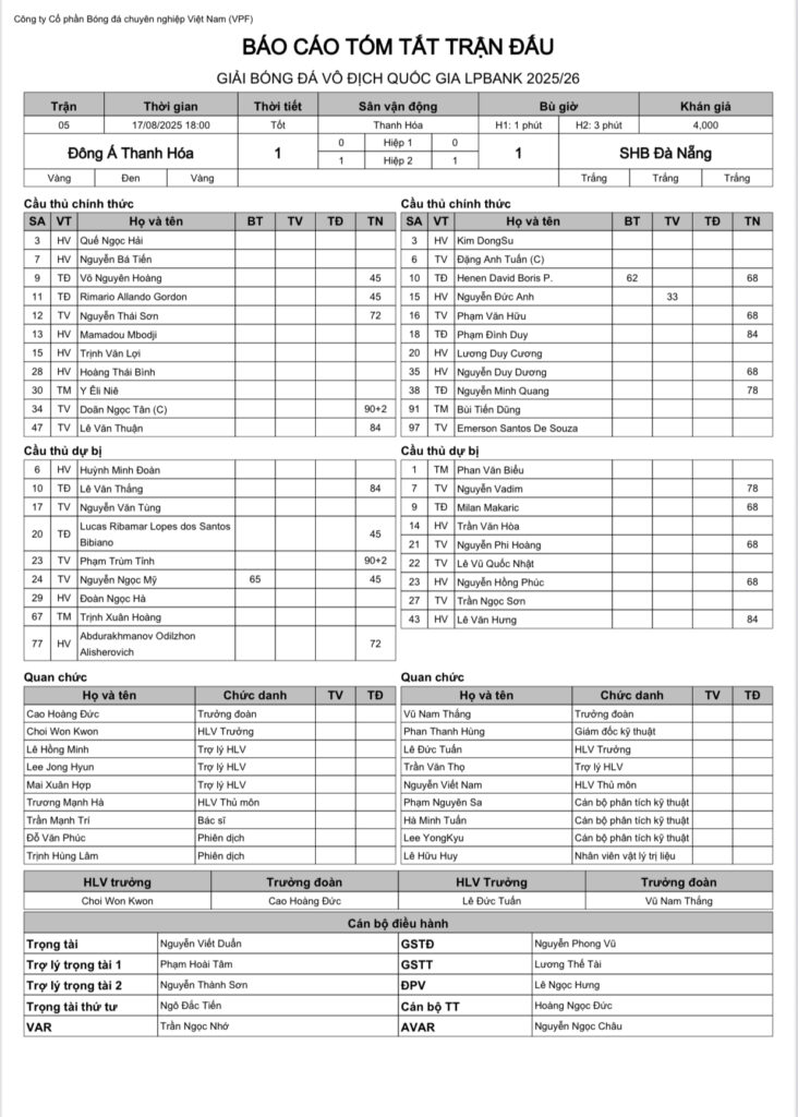 Báo cáo trận đấu CLB Đông Á Thanh Hoá vs CLB SHB Đà Nẵng (vòng 1 LPBank V.League 1-2024/25)