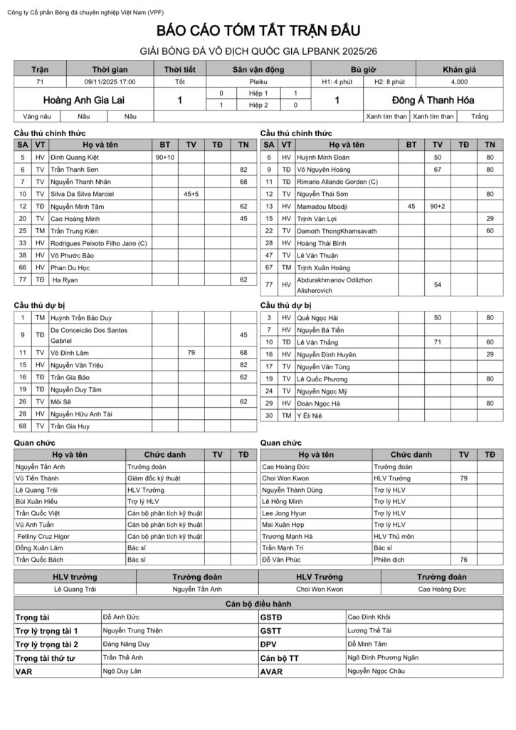 Báo cáo trận đấu CLB HAGL vs CLB Đông Á Thanh Hoá (vòng 11 Giải VĐQG LPBank 2025/26)