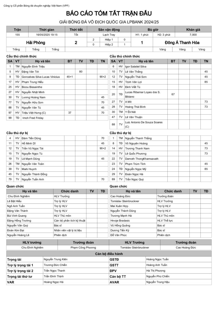 Báo cáo trận đấu CLB Hải Phòng vs CLB Đông Á Thanh Hóa (vòng 23 VĐQG LPBank 2024/25)