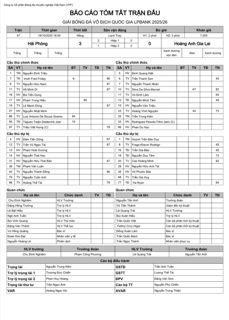 Báo cáo trận đấu CLB Hải Phòng vs CLB Hoàng Anh Gia Lai (vòng 7 Giải VĐQG LPBank 2025/26)