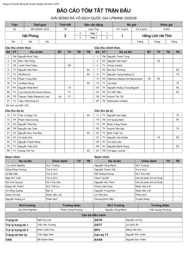 Báo cáo trận đấu CLB Hải Phòng vs CLB Hồng Lĩnh Hà Tĩnh (vòng 8 VĐQG LPBank 2025/26)
