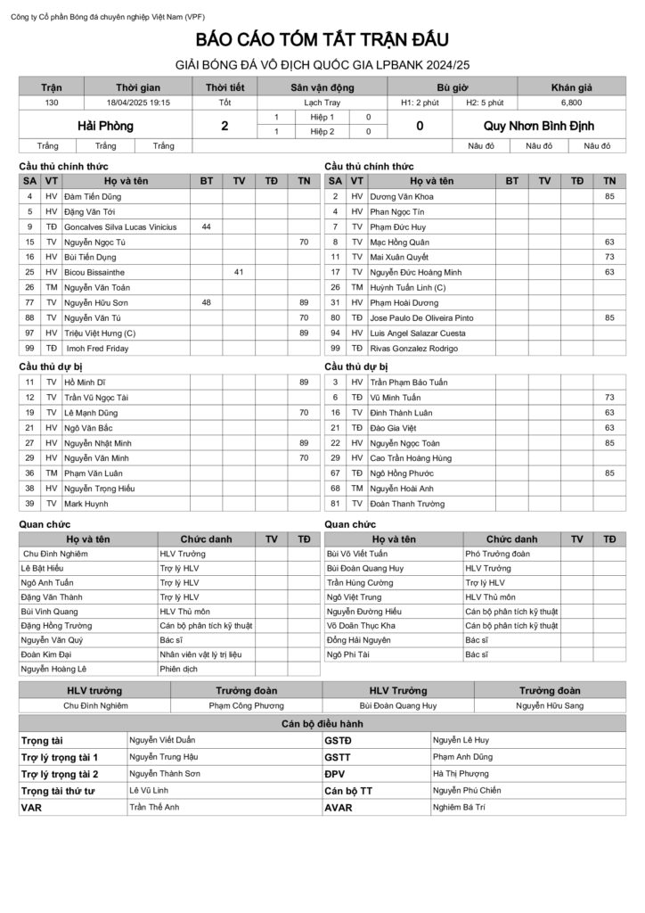 Báo cáo trận đấu CLB Hải Phòng vs CLB Quy Nhơn Bình Định (vòng 19 VĐQG LPBank 2024/25)