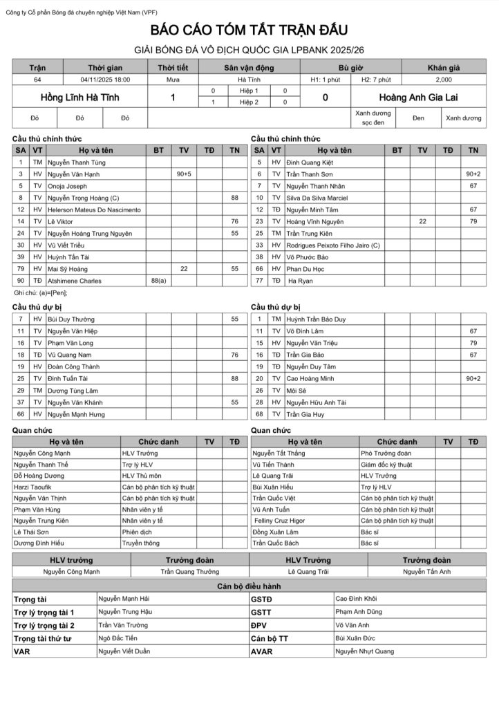 Báo cáo trận đấu CLB Hồng Lĩnh Hà Tĩnh vs CLB Hoàng Anh Gia Lai (vòng 10 VĐQG LPBank 2025/26)