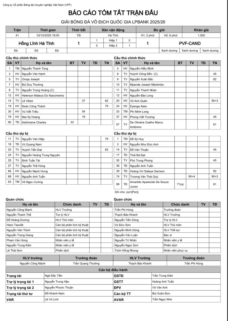 Báo cáo trận đấu CLB Hồng Lĩnh Hà Tĩnh vs CLB PVF CAND (vòng 6 VĐQG LPBank 2025/26)