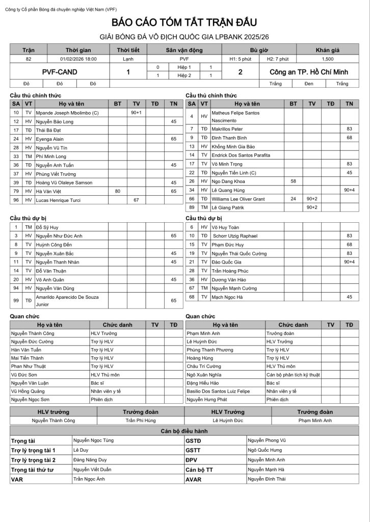 Báo cáo trận đấu CLB PVF CAND vs CLB Công An TP. Hồ Chí Minh (vòng 12 VĐQG LPBank 2025/26)