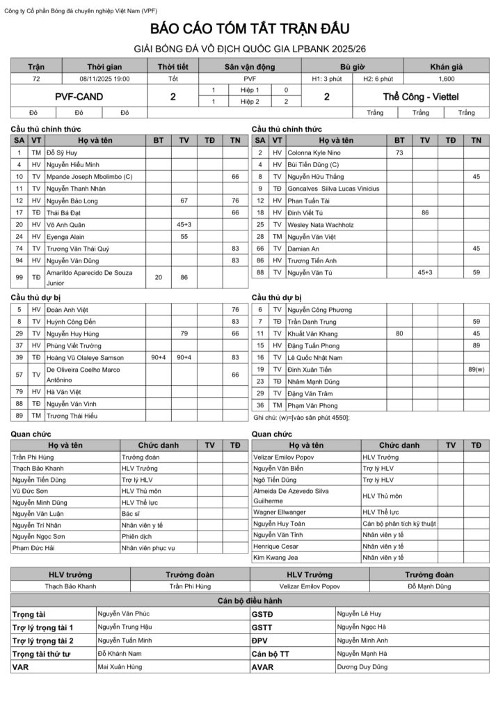 Báo cáo trận đấu CLB PVF CAND vs CLB Thể Công Viettel (vòng 11 VĐQG LPBank 2025/26)