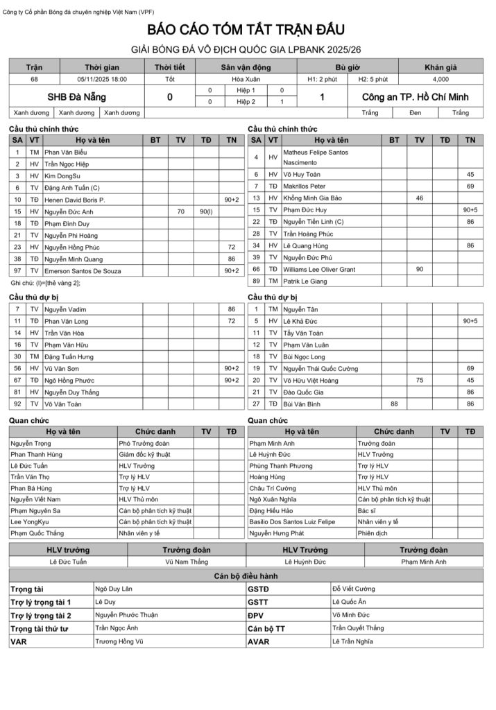 Báo cáo trận đấu CLB SHB Đà Nẵng vs CLB Công An TP Hồ Chí Minh (vòng 10 VĐQG LPBank 2025/26)