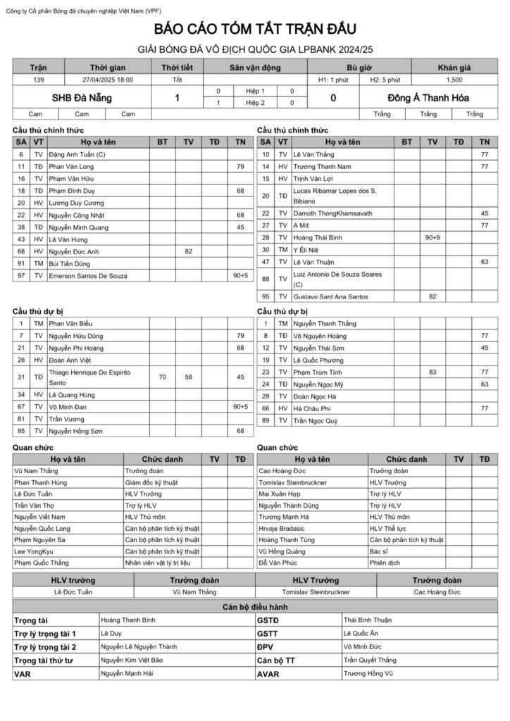 Báo cáo trận đấu CLB SHB Đà Nẵng vs CLB Đông Á Thanh Hoá (vòng 20 LPBank V.League 1-2024/25)