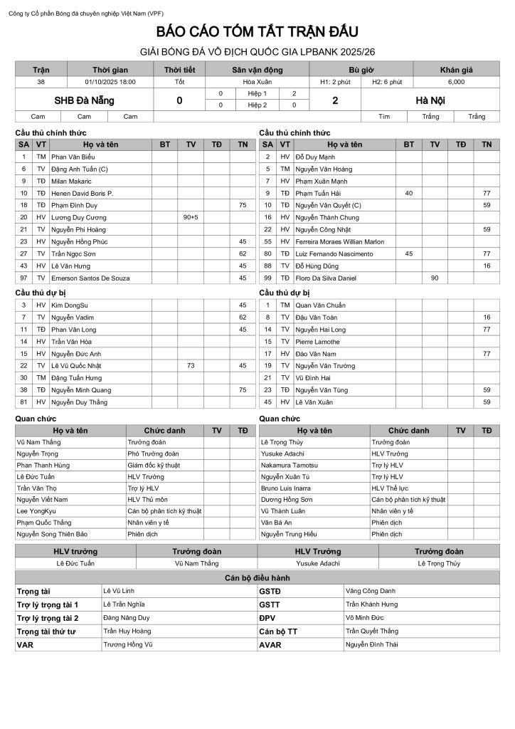 Báo cáo trận đấu CLB SHB Đà Nẵng vs CLB Hà Nội (vòng 6 VĐQG LPBank 2025/26)