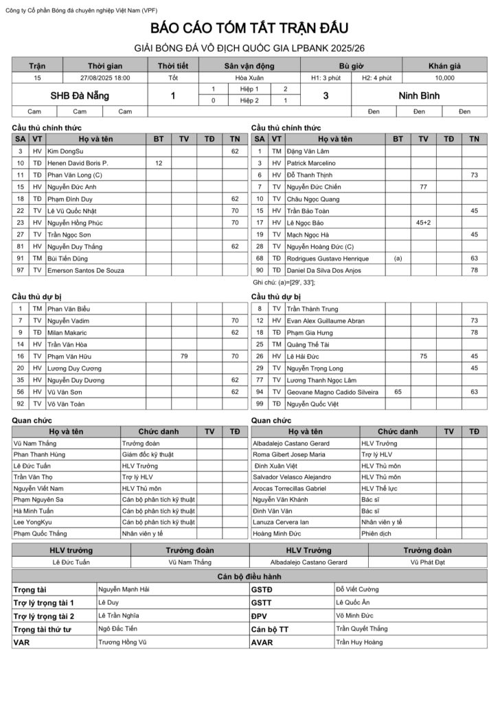 Báo cáo trận đấu CLB SHB Đà Nẵng vs CLB Ninh Bình (vòng 3 VĐQG LPBank 2025/26)