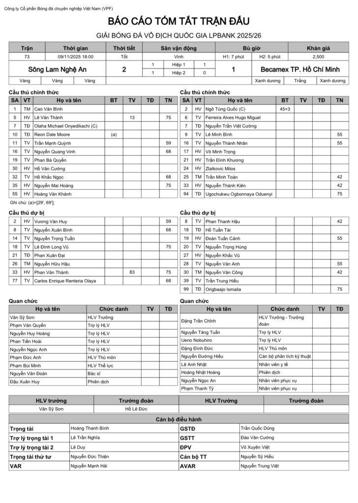 Báo cáo trận đấu CLB Sông Lam Nghệ An vs CLB Becamex TP.HCM (vòng 11 Giải VĐQG LPBank 2025/26)