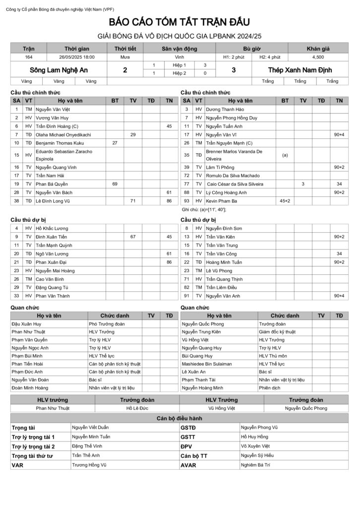 Báo cáo trận đấu CLB Sông Lam Nghệ An vs CLB Thép Xanh Nam Định (vòng 24 VĐQG LPBank 2024/25)