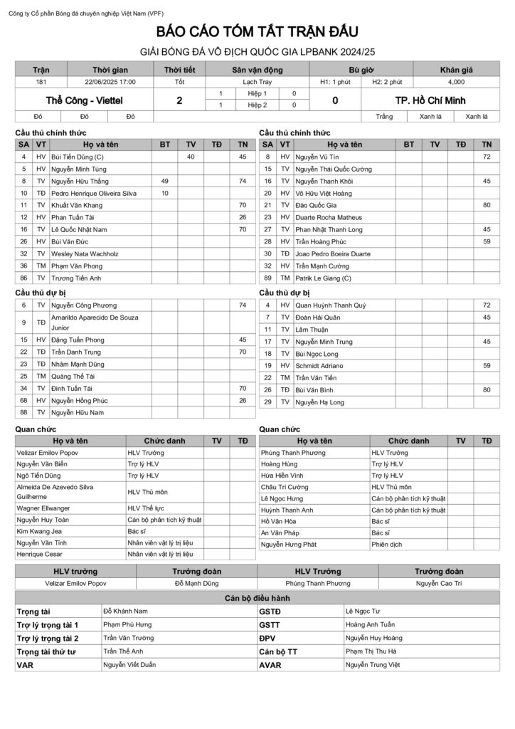 Báo cáo trận đấu CLB Thể Công Viettel vs CLB TP.HCM (vòng 26 VĐQG LPBank 2024/25)