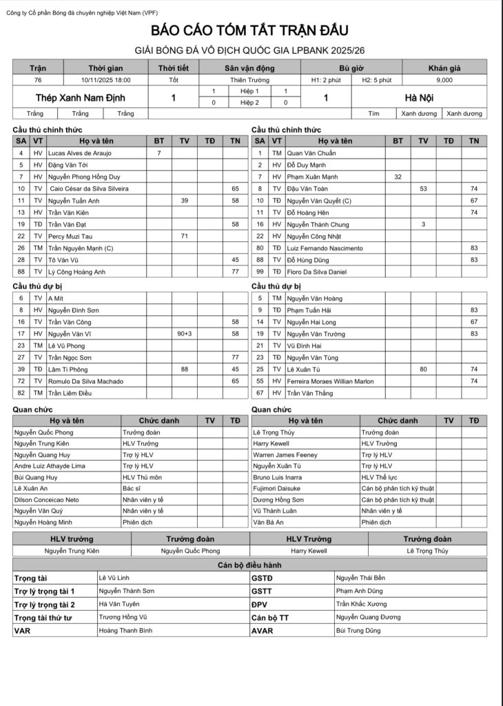 Báo cáo trận đấu CLB Thép Xanh Nam Định vs CLB Hà Nội (vòng 11 VĐQG LPBank 2025/26)