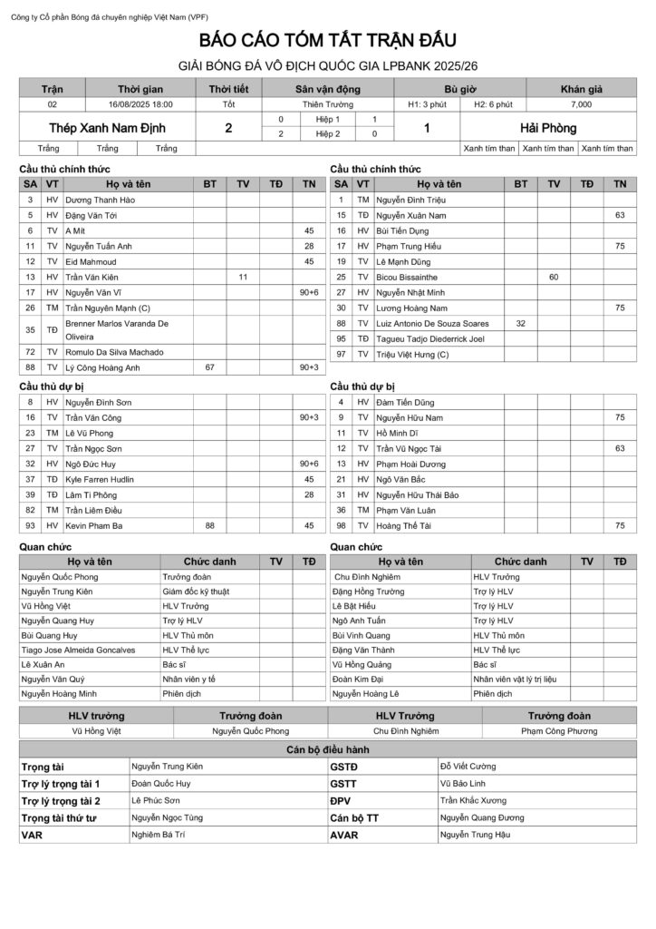 Báo cáo trận đấu CLB Thép Xanh Nam Định vs CLB Hải Phòng (vòng 1 VĐQG LPBank 2025/26)