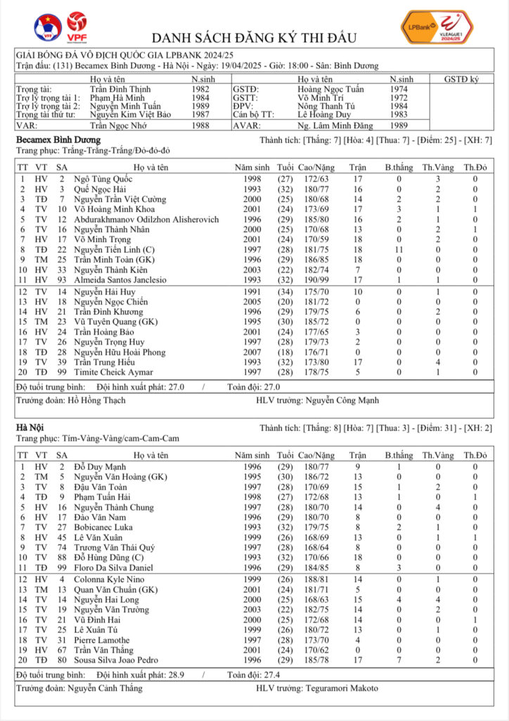Danh sách đăng ký thi đấu CLB Becamex Bình Dương vs CLB Hà Nội (vòng 19 LPBank V.League 1-2024/25)