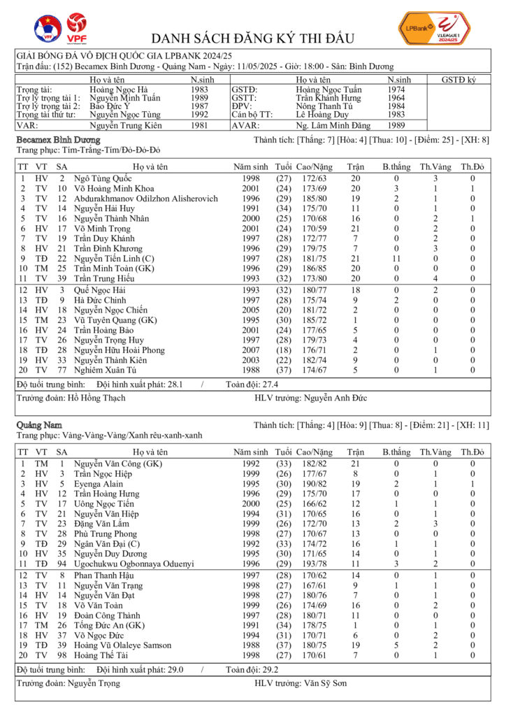 Danh sách đăng ký thi đấu CLB Becamex Bình Dương vs CLB Quảng Nam (vòng 22 VĐQG LPBank 2024/25)