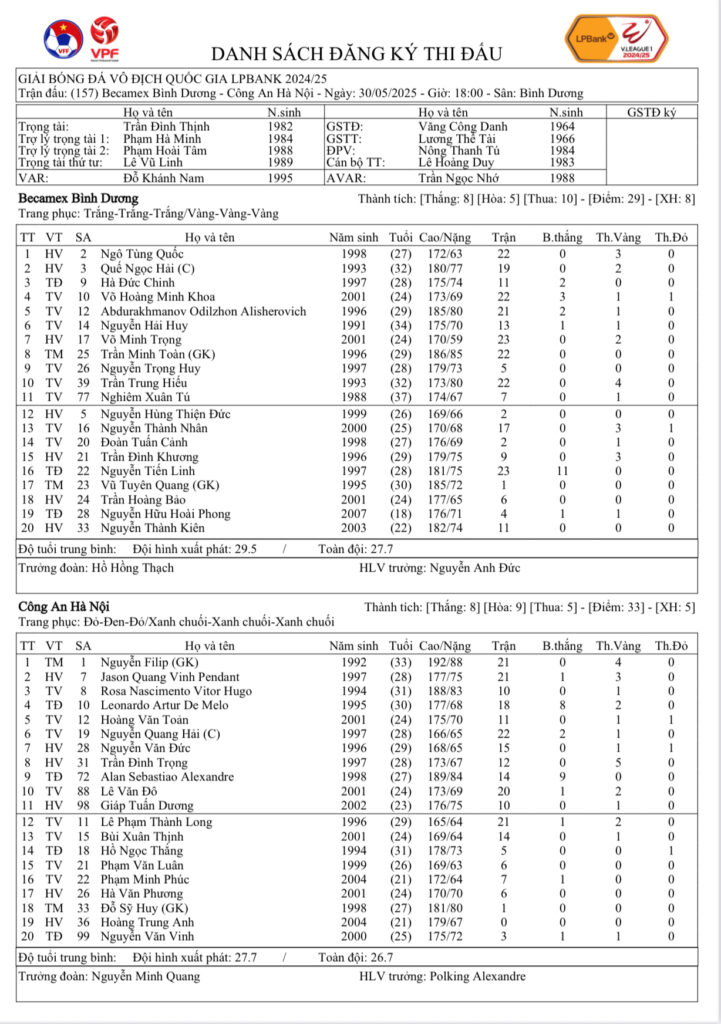 Danh sách đăng ký thi đấu CLB Becamex Bình Dương vs Công an Hà Nội (trận đấu bù vòng 23 LPBank V.League 1-2024/25)