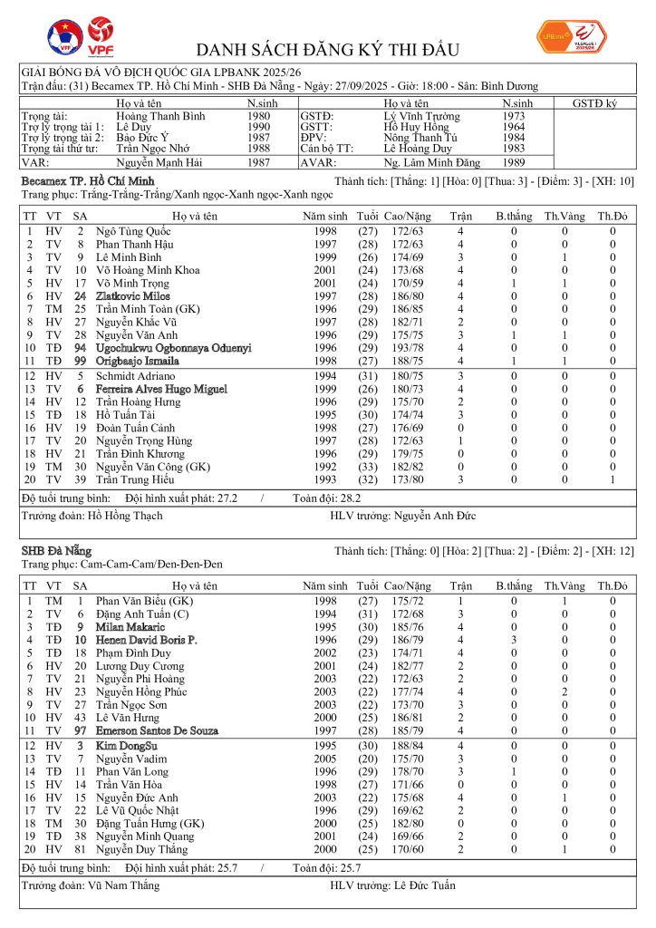 Danh sách đăng ký thi đấu CLB Becamex TP Hồ Chí Minh vs CLB SHB Đà Nẵng (vòng 5 VĐQG LPBank 2025/26)