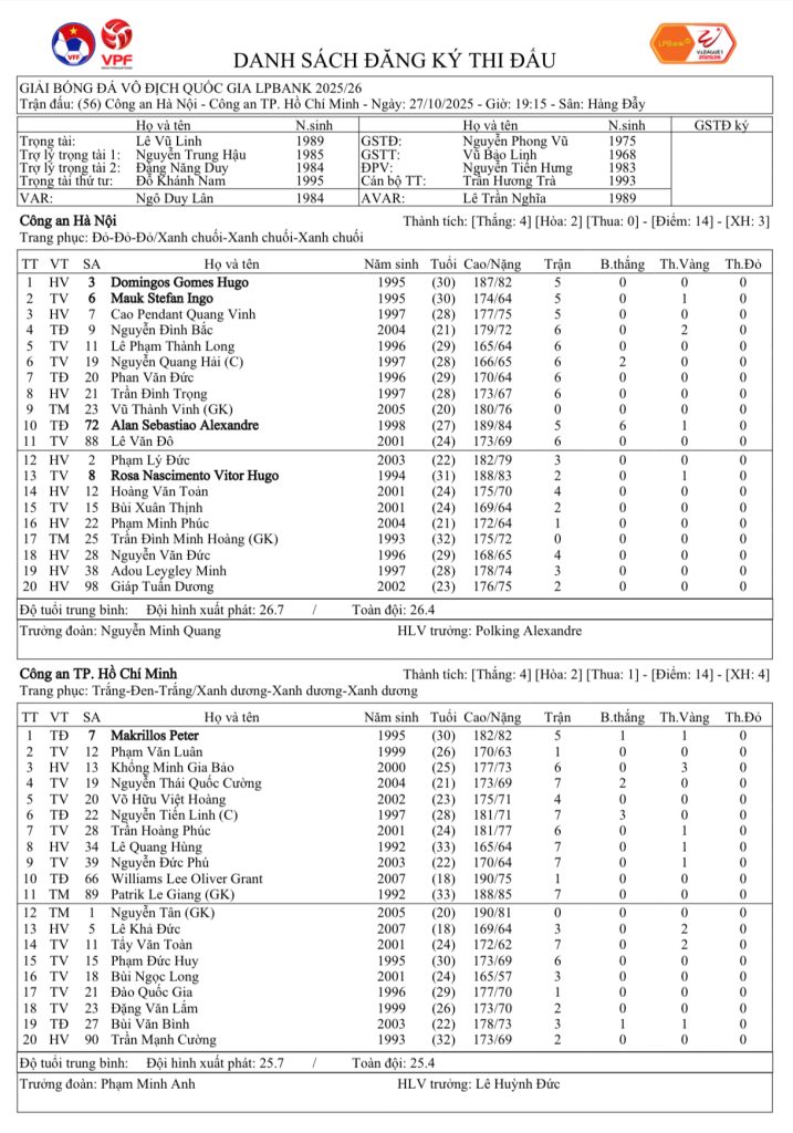 Danh sách đăng ký thi đấu CLB CAHN vs CLB CA TPHCM (vòng 8 Giải VĐQG LPBank 2025/26)