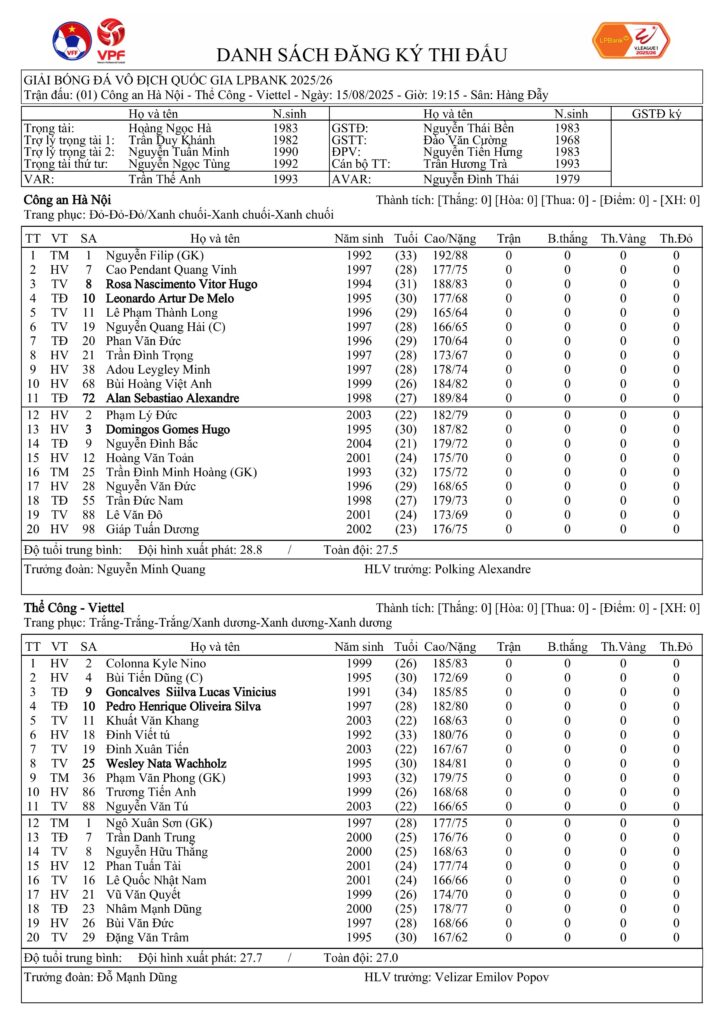 Danh sách đăng ký thi đấu CLB Công An Hà Nội vs CLB Thể Công Viettel (vòng 1 VĐQG LPBank 2025/26)