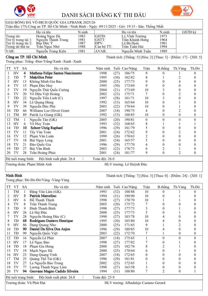 Danh sách đăng ký thi đấu CLB Công an TP.HCM vs CLB Ninh Bình (vòng 11 Giải VĐQG LPBank 2025/26)