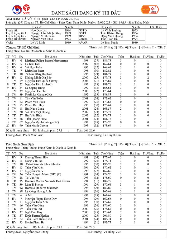 Danh sách đăng ký thi đấu CLB Công An TP HCM vs CLB Thép Xanh Nam Định (Đá sớm vòng 6 LPBank V.League 1 – 2025/26)