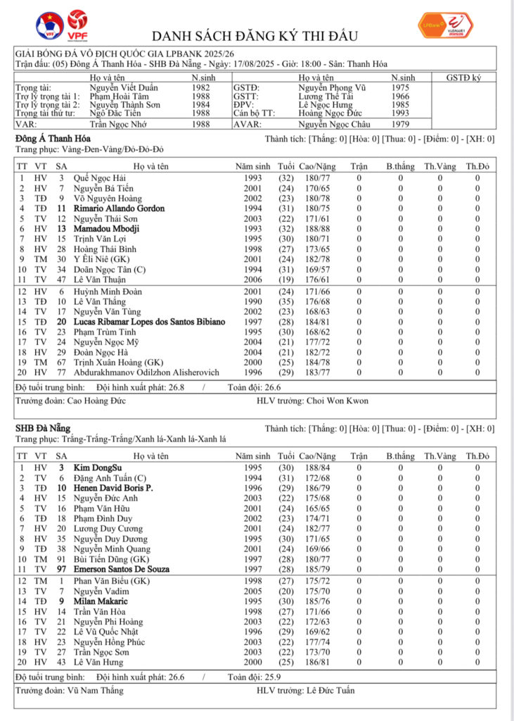 Danh sách đăng ký thi đấu CLB Đông Á Thanh Hoá vs CLB SHB Đà Nẵng (vòng 1 LPBank V.League 1-2024/25)