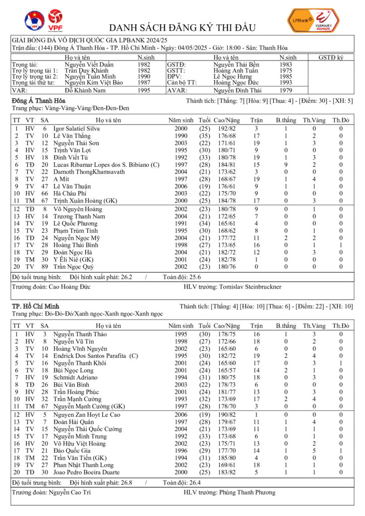 Danh sách đăng ký thi đấu CLB Đông Á Thanh Hóa vs CLB TP.HCM (vòng 21 VĐQG LPBank 2024/25)