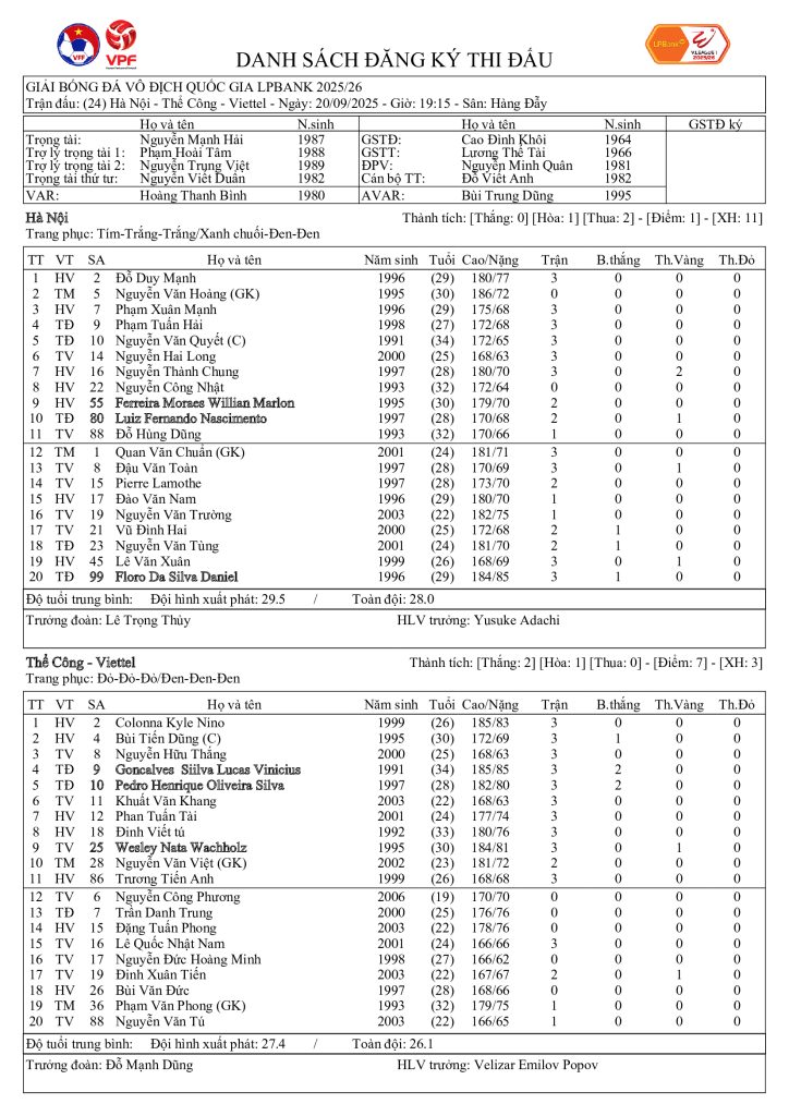 Danh sách đăng ký thi đấu CLB Hà Nội vs CLB Thể Công Viettel (vòng 4 VĐQG LPBank 2025/26)